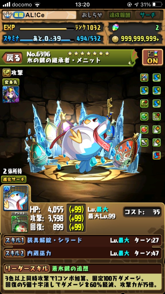 今回はメニットの無効貫通で抜くので火力については一切期待できません。潜在覚醒も適当でいいです。